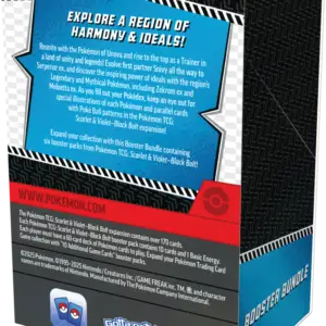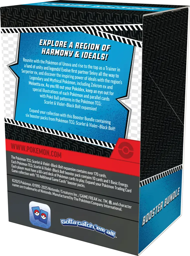 Poznaj region harmonii i prawdy z Pokémon TCG: Scarlet & Violet – Black Bolt & White Flare – Booster Bundle. Ponownie spotkaj się z Pokémonami z Unovy i wznieś się na szczyt jako Trener! Rozwijaj Snivy’ego, Tepiga i Oshawotta aż do Serperiora ex, Emboara i Samurotta, odkryj niezaprzeczalną moc z legendarnymi i mitycznymi Pokémonami regionu, w tym Reshiram ex, Keldeo ex, Zekromem ex i Meloettą ex. Wypełniając swój Pokédex, zwróć uwagę na specjalne ilustracje każdego Pokémona i karty ze wzorami Poké Balli w rozszerzeniach Pokémon TCG: Scarlet & Violet – White Flare i Pokémon TCG: Scarlet & Violet – Black Bolt!