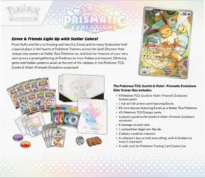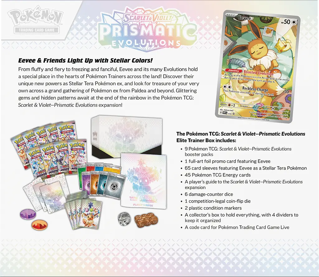 W Prismatic Evolutions, miłośnicy Eevee i jego ośmiu ewolucji znajdą coś dla siebie, gdyż wszystkie te formy są dostępne jako olśniewające Pokémon ex typu Stellar Tera. Rozszerzenie to także kopalnia rzadkich kart z unikatowymi, oszałamiającymi ilustracjami, które podkreślają piękno świata Pokémon.