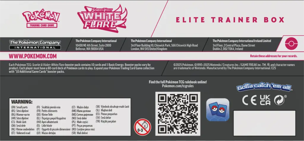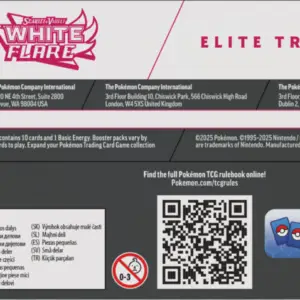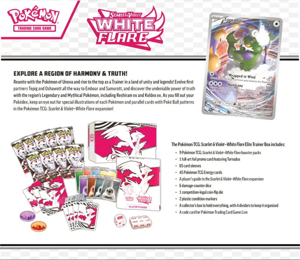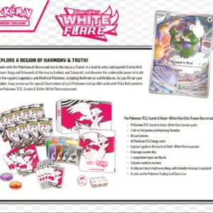 Poznaj region harmonii i prawdy z Pokémon TCG: Scarlet & Violet – White Flare – Elite Trainer Box. Połącz siły z Pokémonami z Unovy i wznieś się na szczyt jako Trener! Rozwijaj Snivy’ego, Tepiga i Oshawotta aż do Serperiora ex, Emboara i Samurotta, odkryj niezaprzeczalną moc z legendarnymi i mitycznymi Pokémonami regionu, w tym Reshiram ex, Keldeo ex, Zekromem ex i Meloettą ex. Wypełniając swój Pokédex, zwróć uwagę na specjalne ilustracje każdego Pokémona i karty ze wzorami Poké Balli w rozszerzeniach Pokémon TCG: Scarlet & Violet – White Flare i Pokémon TCG: Scarlet & Violet – Black Bolt!